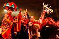 Ryujin Densetsu...The magestic dragon dance with eisa drums and lion dance performed by a group of more than 15 people is an amazing masterpiece.